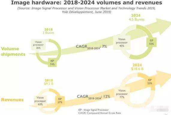 根据Yole的一份市场统计,VP芯片从2018年至2024年期间的复合年增长率(CAGR)高达18%,预计2024年将达到145亿美元规模。同时,ISP芯片保持低速稳定增长态势,2018年至2024年期间的复合年增长率仅为3%,预计2024年将达到42亿美元规模。