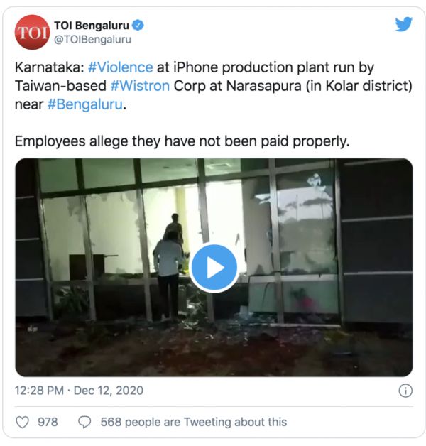 印度媒体报道纬创位于纳尔萨普尔的工厂遭到破坏/Twitter