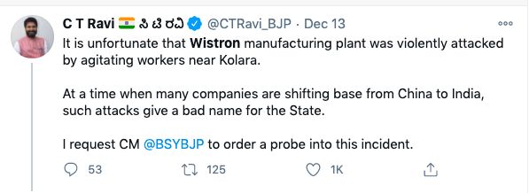 卡纳塔克邦的副首席部长Ashwath Narayan表示,“我们初步调查显示事件是因未支付薪水有关,愤怒已酝酿多时。如果劳工面临这类问题,他们应该要与劳工专员或地方专员接洽。”