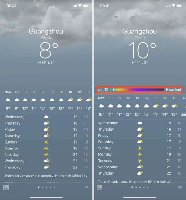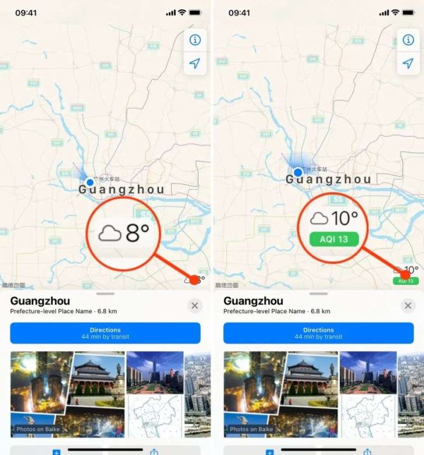 除了天气应用外,本次更新还将 AQI 指数加入了地图应用。在你使用地图安排出行计划时,不仅可以在右下角看到当地温度和天气,现在还能了解当地的空气质量,方便你在出行前做好万全的准备。
