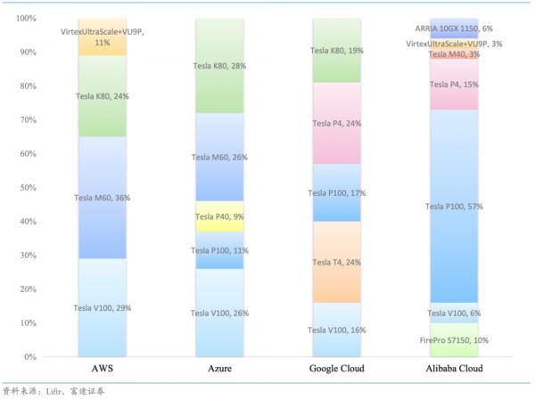 数据中心正处于AI转型过程中,GPU市场呈现英伟达、AMD两强争霸,英伟达占比70%,全球TOP4云计算数据中心(亚马逊AWS、微软Azure、阿里云、谷歌云)都大量采用英伟达Tesla GPU。