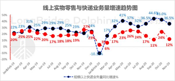 (2)如果结合邮局快递行业数据:11 月行业快递量增速(以电商快递运单为主,且是市场增量贡献主力,其他还有 C 端个人件、B 端商务件、退单等相对稳态的业务)从 10 月份的 43% 放缓至 36.5%。快递单量的放缓速度明显慢于线上零售从 24% 到 12% 的放缓速度。