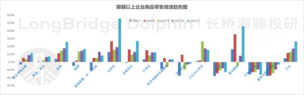 同时,虚拟与服务(以携程、58 同城等为典型)线上零售额 10 月的报复性反弹昙花一现,11 月天气逐步变冷、本地疫情开始局部出现后,增速快速回落。