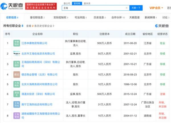 天眼查App显示,职业打假人王海名下目前共关联8家公司,包括江苏申康物资有限公司、北京市王海在线资讯有限公司、王海国际商务顾问(深圳)有限公司等,其中湖南省醴陵市王海管理咨询有限公司、南宁王海热线咨询有限公司被吊销营业执照,清道夫投资(深圳)有限公司已注销。