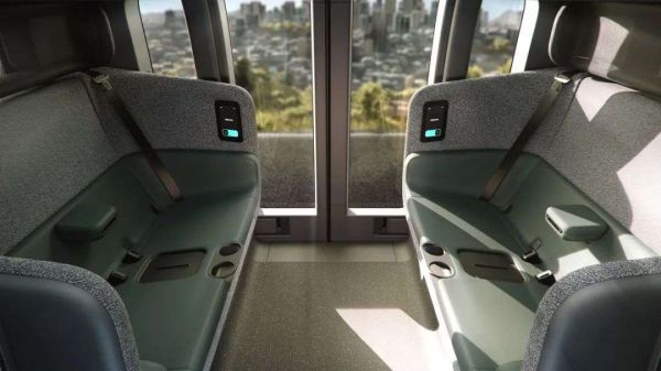 6. 内饰设计走的也是简洁风,不像现在的车辆那样拥有复杂仪表和各种功能按钮,Zoox 只给大家留了一块小屏幕和充电口而已。座椅方面,也针对 Robotaxi 的任务进行了优化,更易清洁且相当耐用。