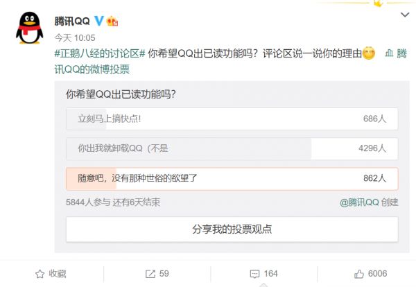 近日,腾讯QQ官网在微博上悄然发起了新功能投票,没想到这次调查竟然在网络上引起了大量讨论。有人觉得该功能很有实际意义,也有人表示QQ敢出这个功能就立刻卸载。截稿发布时,腾讯QQ官方已经删除该投票贴,共有5844人参与,其中将近75%的用户投了反对票。