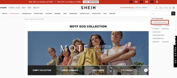 在SheIn的官网中进行搜索,其搜索栏热搜中就显示着“MOTF Premium new in”。SheIn Premium的高端品牌MOTF包括:城市之光(City Lights)、新经典(New Classic)、甜蜜浪漫(Sweet Romance)和派对模式(Party Mode)、舒适系列(Comfy Collection)等几个类别。