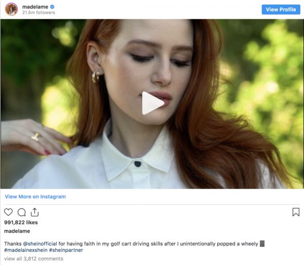 SheIn逐渐在海外打出了名气,也在品牌打造上走得更远。2019年9月,SheIn还找到美剧《河谷镇》中的演员Madelaine Petsch,拍摄了Madelaine穿着SheIn的夏季系列,在豪华的乡村庄园里散步的视频广告,Madelaine在Instagram上拥有2100多万的粉丝。