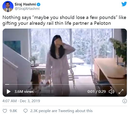 Twitch 新闻节目播主 Siraj Hashmi 发推讽刺这条广告:没有什么比送已经超瘦的太太一台 Peloton 更能表达“你该减几磅肉了”。