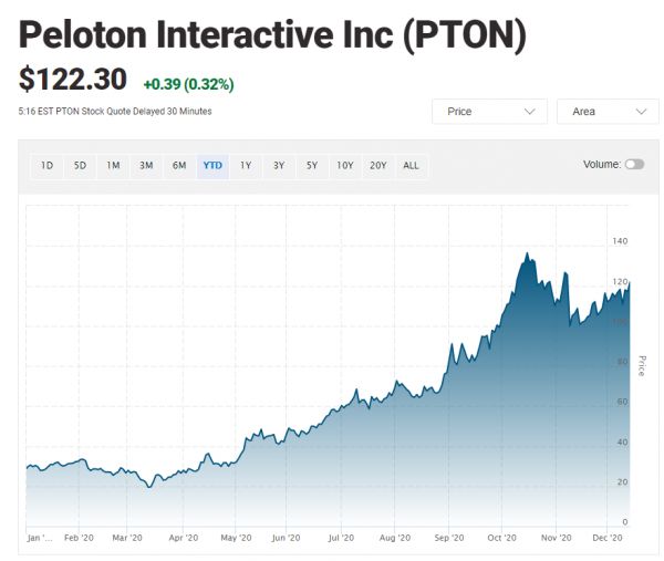 相应地,Peloton 的股价也在今年暴涨。截至本文成稿,该公司的市值已经高达356亿美元。也是在本周,纳斯达克正式将 Peloton 等公司选入了最新的纳斯达克100指数。