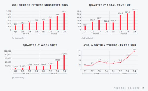 该公司在告股东书中表示,2020财年第四季度的营收增幅达到172%,各项业务收入综合超过6亿美元。整个财年收入较去年翻番,达到18亿美元。Peloton 在Q4也首次实现了盈利,净收入约9000万美元,毛利率47.6%。