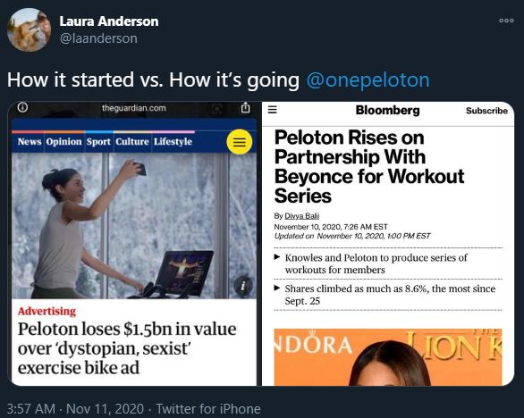 Peloton 在今年的突出表现,令人不敢相信这家公司在去年的这个时候曾经面临着后果不可估量的严重公关危机。有人也做了 Peloton 版本的 How it started vs how it's going 系列梗: