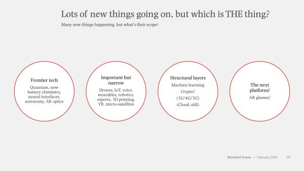 但是,在思考下一步会是什么的问题上,上述办法可能都是错误的思维模式。除了审视“大型机——PC——Web——智能手机”这个发展顺序以外,我们也许还应该考虑一下底层的情况:“数据库——客户端/服务器——开源——云计算”。也就是说,虽然有些进展没那么明显,但同样的重要。按照这种模型,当今的基本趋势显然是机器学习,也许还有加密。很明显,我们正在围绕着机器学习重塑整个技术行业,可能还会改造更多的其他行业。虽然有明确的理由说明智能手机之后近期内不会有任何新的大事物的出现,但是我认为没有人会认为机器学习之后不会有任何东西出现——创新和创造是一个连续的过程(实际上像钟摆,从服务器转到本地然后又转回服务器)。与此同时,如果你来自硅谷的话,那么类似云计算和SaaS之类的东西似乎已经变成古老而又无聊的话题,但是到目前为止,只有大约四分之一的大型企业的工作流已完全迁移至云端——其余的仍在“本地”的旧系统,甚至在大型机上运行。在接下来的一、二十年的时间里,把剩下的迁移到云端还需要大量的工作要做,还会因此诞生大量的公司(这确实就是我所认为的“数字化转型”的意思)。