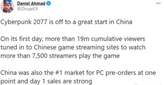 Niko Partners分析师Daniel Ahmad在推特上表示《2077》在中国国内取得了良好开端,中国市场曾在某一时间点是《2077》PC版预定的第一大市场,并在发售第一天保持了强劲的销量。其也在文中表示国内玩家绝大多数选择在Steam平台进行下载或从亚洲其他地区、美国市场进口游戏。