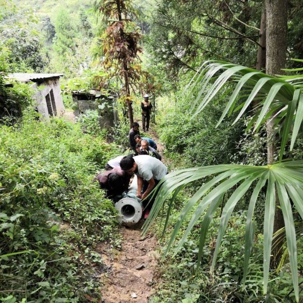 该基站建设过程中的照片存档。即使塔可以拆卸搬运,主杆仍需要8-9人搬运上山。(图:中国铁塔毕节分公司)