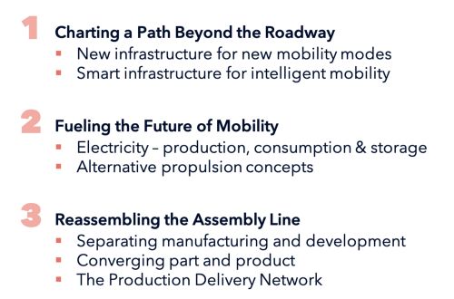 对基础设施创新涉及到的各方面因素的深入分析,超出了本文的范畴。相比之下,我们希望将基础设施创新落脚到三个经常讨论和涉及到的主题类别:移动出行的多样化、替代性推进技术的出现,以及制造业的转型。