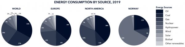 上图中,四图依次是2019年全球、欧洲、北美和挪威的能源结构饼状图。其中,从颜色最深至最浅,分别代表石油、煤、天然气、核能、氢能、风能、太阳能、生物燃料以及其他可再生能源。图片来源:Our World in Data