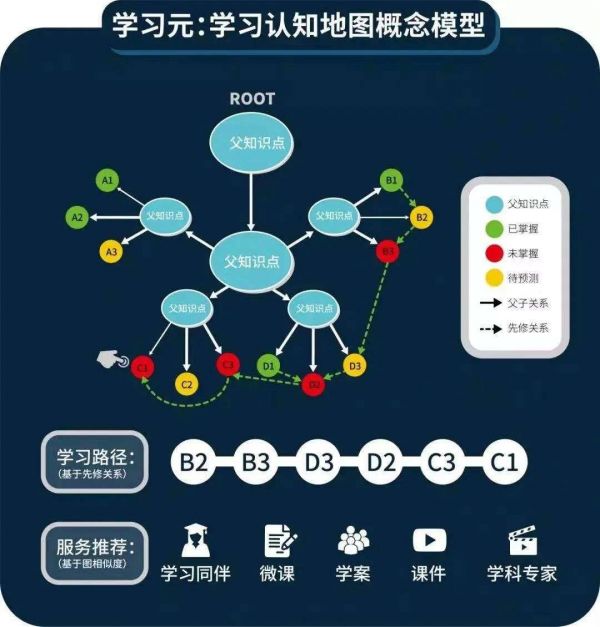 从上图中学习元认知的知识图谱模型中可以看到,学生在大量测评和重复练习下形成规则排序的知识元联系。用红色和黄色的图形区分学生未掌握和未测试的知识点。针对这些知识点不同的掌握情况,系统能够为老师和学生推荐最优学习路径,依照这一学习路径,教学系统将不同的课件和题目进行排列组合,从而将最符合要求的知识点素材精准地推送给学生。