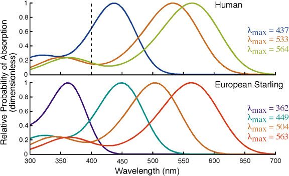 人和鸟类视锥细胞对光的敏感性(图片来源:Palaeontologia Electronica)