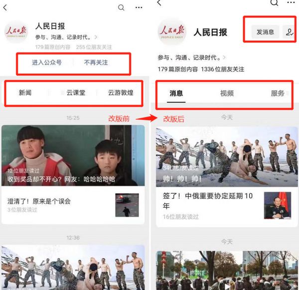 这一更新,淡化了用户在关注账号前对功能的探索,进一步突出强调了公众号的内容尤其是视频。