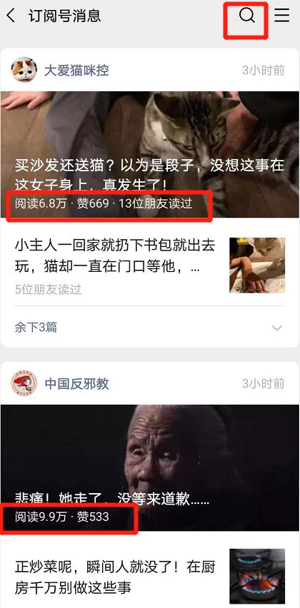 “订阅号消息”字样不再显示在顶部中间,而是被移至左侧。之前在订阅号消息列表中,用户可以通过下拉页面找到搜索框,更新后页面顶部右侧新增放大镜图标,点击可直接搜索。