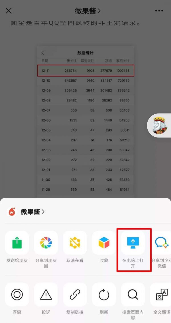 据微果酱截图显示,在电脑端登录微信后,用户用手机浏览文章时可以选择“在电脑上打开”,此时电脑端将会弹出用户正在阅读的这篇文章。