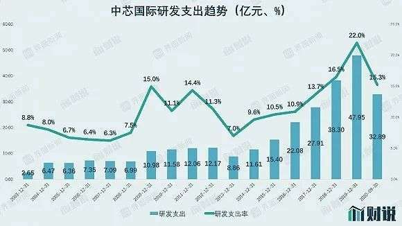 但凡事皆有两面。公司业绩表现良好的另一面是在研发上略显保守,从2013年到2016年这四年,公司研发费用率的波动区间在7%到11%之间,相对偏低。从2017年开始,中芯国际的研发费用率不断攀升,到2019年已经增至近22%,是公司上市以来的最高水平。