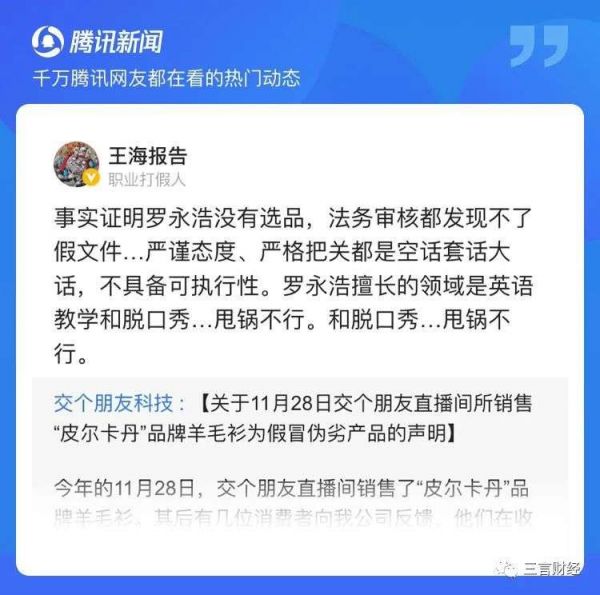 对此,职业打假人王海称,“事实证明罗永浩没有选品”、“甩锅不行”。王海表示,“法务审核都发现不了假文件……严谨态度、严格把关都是空话套话大话,不具备可执行性”。