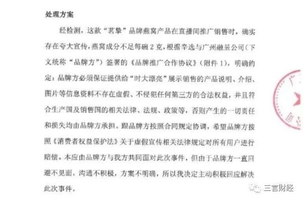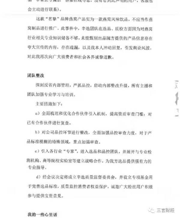 声明提到,品牌方虚假宣传。而辛选团队在选品、质检方面因为对燕窝行业相关专业知识储备不够,未能甄别出品牌方提供的产品信息存在夸大宣传的内容,存在疏漏。还将进行团队整改。