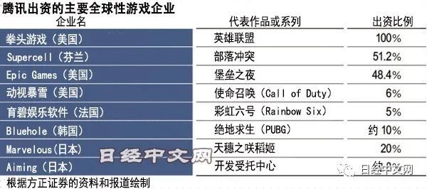据称腾讯向全球100家游戏企业出资,除了投资收益之外,还不断积累打造热门作品的游戏系统和人物开发的知识及经验。出资对象包括美国动视暴雪 (Activision Blizzard)、法国育碧娱乐软件(Ubisoft)和美国Epic Games等。