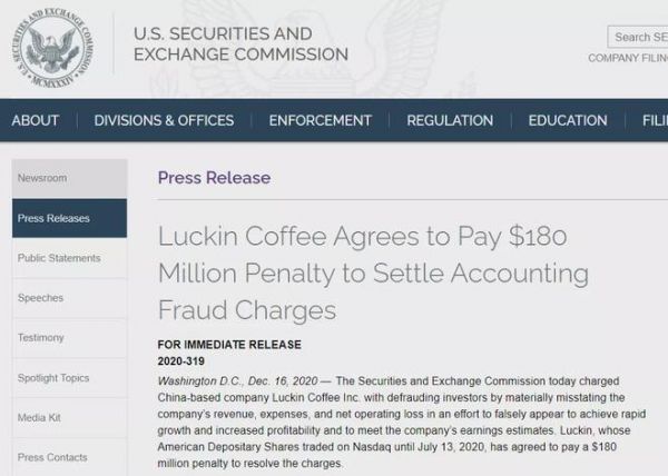 当天早些时候,SEC在官网也发布了相关公告。公告附带的起诉书称,至少在2019年4月到2020年1月之间,瑞幸咖啡通过三个独立的购买计划,利用关联方对销售交易进行造假,故意捏造了超过3亿美元的零售额。起诉书称,瑞幸咖啡的某些员工试图通过将公司费用夸大逾1.9亿美元以创建一个虚假的运营数据库,并篡改会计和银行记录来反映造假的销售额,借此掩盖其欺诈行为。