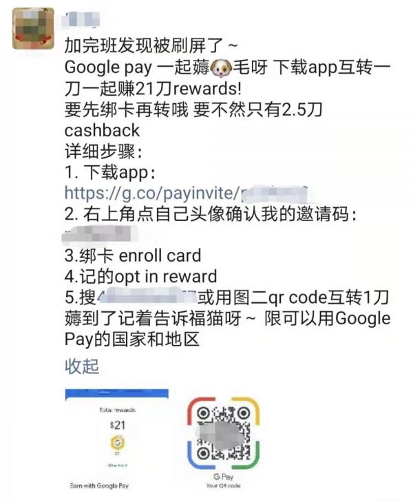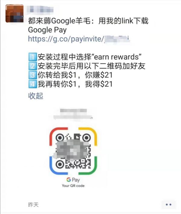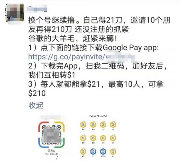 昨天下午,加州时间17点左右,Google Pay(谷歌支付)悄悄上线了一次网赚式的营销,大体是邀请朋友注册谷歌支付,并互相转账1美元后,可与朋友各获得21美元的奖励。这可是实打实的撒钱,于是一时间朋友圈出现了如下盛况: