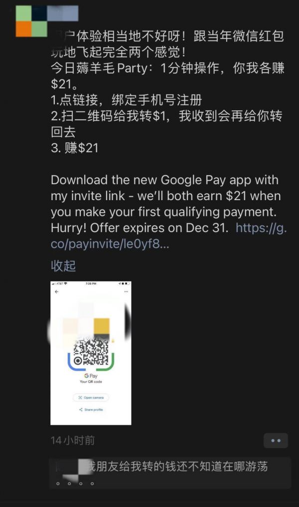 或许是黑五的买买买让大家钱包都空了,这个活动一瞬间就爆炸式流传开来。朋友圈,各大硅谷微信活动群,租房群,交友群全都热闹开了,为了抢占更多的新用户名额,获得高达231美金的全部奖励,大家都在疯狂分享自己的Goolge Pay 下载链接和收款二维码。