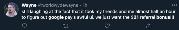“实在是太逗乐, 我和我朋友花了半个小时才弄明白Google Pay 糟糕的界面, 我们只是单纯的想要那21刀的奖励!!!”