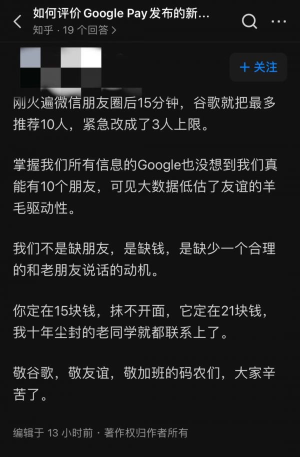 知乎上就有人表示,“感谢Google Pay 让我联系上了老友。”