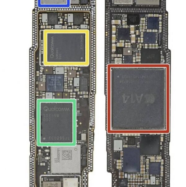 iPhone 12 搭载的高通 SDR865 射频收发器(黄色区域),以及高通 X55 基带芯片(绿色区域)。图片来自:iFixit