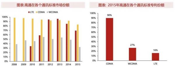 方正证券的一份报告也指出,尽管高通在 3G 时代进入 WCDMA 市场略晚,但它更注重专利的质量而非数量,所以在仅占据 WCDMA 27% 的专利份额下,就获得了约 55% 的 WCDMA 的市场;到了 4G,高通仅拥有 LTE 16% 的专利份额,却最多占据了 96% 的 LTE 市场。