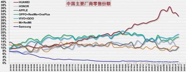 根据安乎都护府长史所整理中国零售数据,截自 2020 年,单计华为的手机市场(不连荣耀),累计占有率已高达 32.5%,目前全国第一。据报道指出,2018 年中国手机市场的销售额高达 9,800 亿元人民币,华为的 32.5% 的份额,全年价值逾 3,000 亿人民币。但在华为受到制裁后,这个 3,000 亿人民币的市场真空,将不得不吐出来给其它竞品手机。