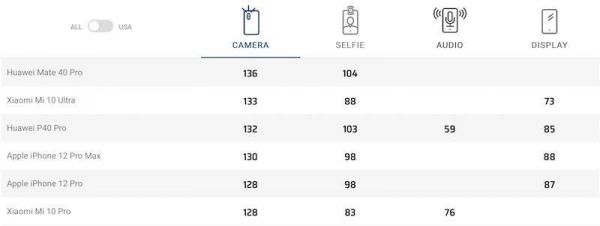 华为手机近年一直霸占 Dxomark 手机摄像头榜单。图片来源:Dxomark。
