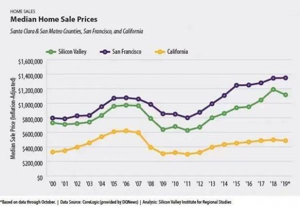 根据最新发布的硅谷指数(Silicon Valley Index),2019年,尽管硅谷地区房价下降6%,但其房价中位数仍高于100万美元,为全美最高。