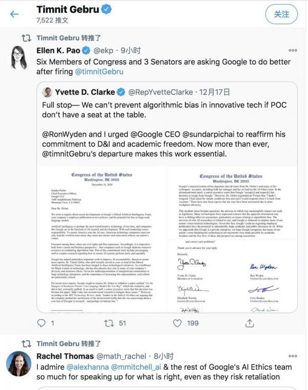 随着双方矛盾的逐渐激化,谷歌内部员工、AI 科技大佬,以及更多网友加入到了这场风波中,比如 Gebru 的谷歌上司、著名 AI 科学家 Samy Bengio 均公开发声支持 Gebru。华盛顿大学教授 Emily Bender 表示:尽管 Jeff Dean 认为这篇论文质量不佳,但这个领域确实还远没有发明出一种能够可靠地消除语言偏见的方法。