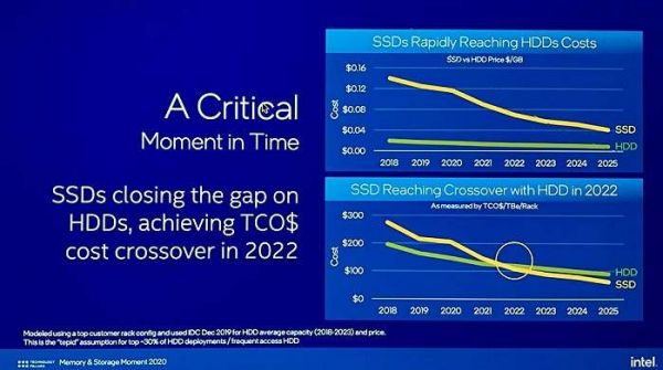 英特尔NAND产品与解决方案事业部高级副总裁兼总经理Rob Crooke在发布会上告诉现场界面新闻等媒体,随着固态硬盘整体成本下滑,到2022年,SSD 与传统机械硬盘(HDD)的总拥有成本(Total Cost of Ownership, TCO)将处于交叉点,即购买SSD的相对花费更少。