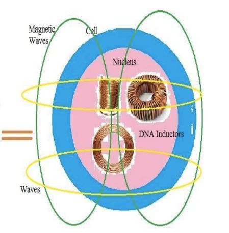 论文配图。图中的蓝色圆形代表细胞,粉红色圆形为细胞核,细胞核内存在“DNA 线圈”,这些线圈可能在外部环境电磁波(绿色线条标示)影响下产生电磁波(黄色线条标示)。