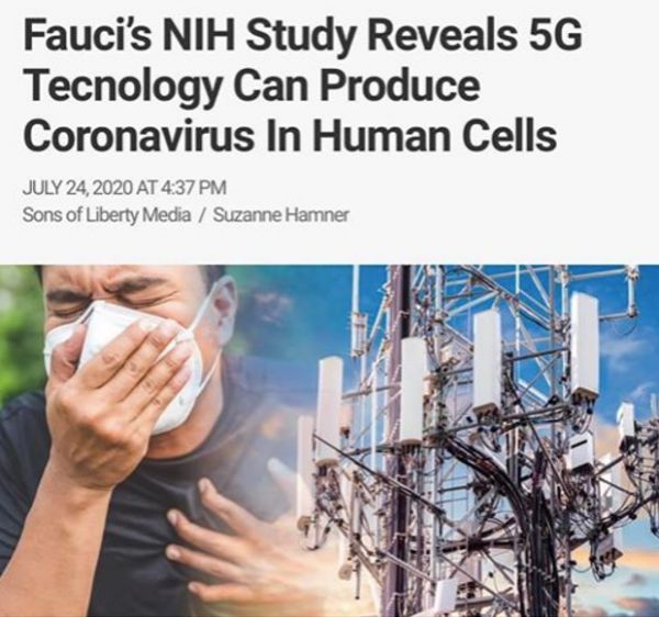 社交网站上由该研究引发的不实新闻。图中标题为:“福奇的 NIH 研究显示 5G 技术能使人类细胞生产新冠病毒”。图源:Facebook 截图