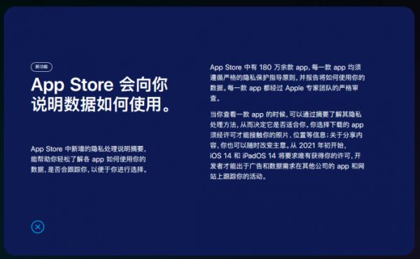 今年 12 月 8 日,苹果软件工程高级副总裁克雷格·费德里希(Craig Federighi)在欧洲数据保护和隐私会上宣布,从 2021 年起,苹果将会要求所有想要跟踪用户的 App 获得用户的明确同意,否则的话,将会从应用商店删除该应用程序。