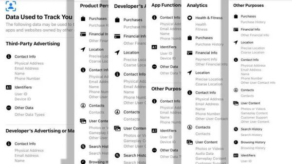 除了 App 本身收集用户信息,App 嵌入的第三方插件或代码等会收集用户信息。这些数据最常用的使用方式之一也是“追踪”,用于定向广告推送或广告评估等目的。苹果此次新上线的隐私保护功能中要求,如果 App 中整合了第三方合作伙伴的插件或代码,如分析工具、广告网络、第三方 SDK 等,也需要说明其收集、使用的数据类型等。