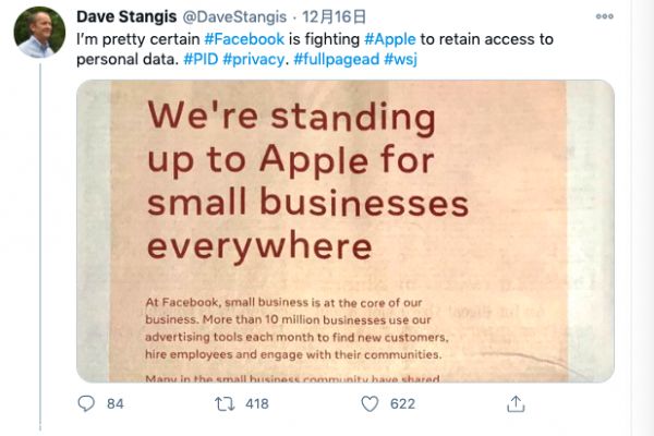 作为反苹果运动的一部分,Facebook 整理出一大堆来自小型企业主的研究案例,并宣称投放个性化广告已经成为维持其业务正常运转的关键。在报纸版面上、在新闻发布会中,Facebook 不厌其烦地分享着小企业主们那令人心酸的遭遇,强调如果不使用 Facebook 的个性化广告,他们根本就坚持不过本轮新冠疫情。很明显,在这场与苹果的正面对抗中,Facebook 抢先打了一手感情牌。