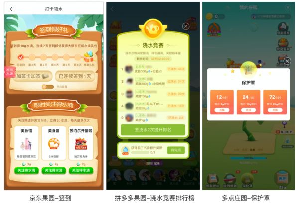 京东果园的签到奖励,拼多多果园的排行榜,都是典型的游戏组件,多点APP的多点庄园更是有保护罩的创意玩法,防止好友偷取肥料。