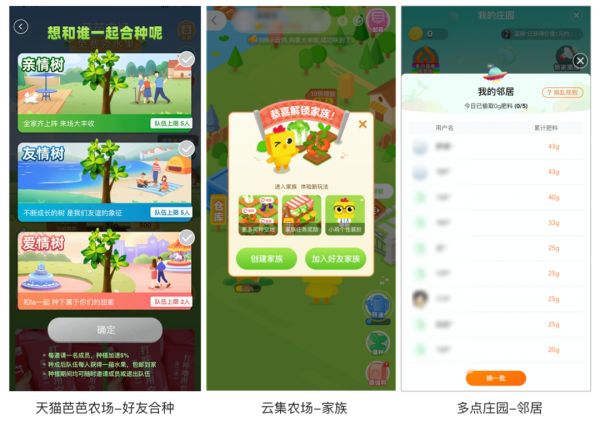 除了在游戏化玩法中增加添加好友的功能外,天猫的好友合种玩法,组队一起种树收获,以及云集农场的家族玩法、多点庄园的邻居玩法都是比较有创意的社交要素,对于游戏化效果提升有较大帮助。