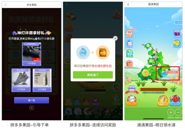 生鲜电商产品叮咚买菜的养鱼玩法,出行平台滴滴的抢车位玩法,以及社交电商拼多多的种果树玩法,都很符合其产品定位,并且是将用户易于理解的线下场景进行线上化。
